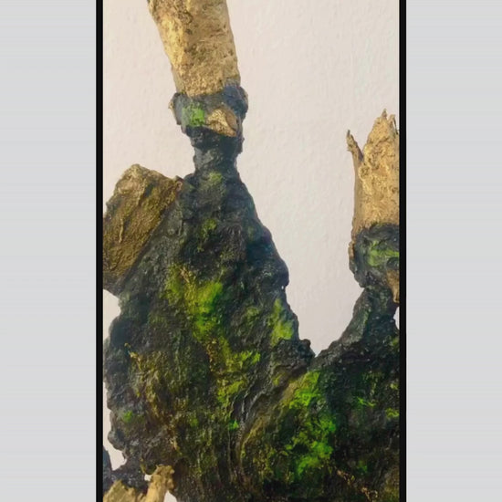 Diese aus Faserbeton gefertigte Skulptur strahlt eine rohe und organische Energie aus. Die drei eng beieinander stehenden Figuren sind mit rauen, texturreichen Oberflächen geformt, bei denen dunkelgrüne und schwarze Töne durch goldene Kronen und Details akzentuiert werden. Das robuste Material verleiht dem Werk einen soliden, fast zeitlosen Charakter und lässt die lebendigen Strukturen klar hervortreten.